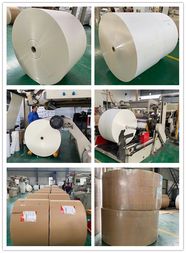 1. El rollo de papel revestido impermeable se hace de materias primas y se procesa en una máquina de la película para convertirse en eventual un rollo blanco enorme. Los clientes pueden modificar la anchura y el grammage del papel y el peso para requisitos particulares de PE según sus propias necesidades.